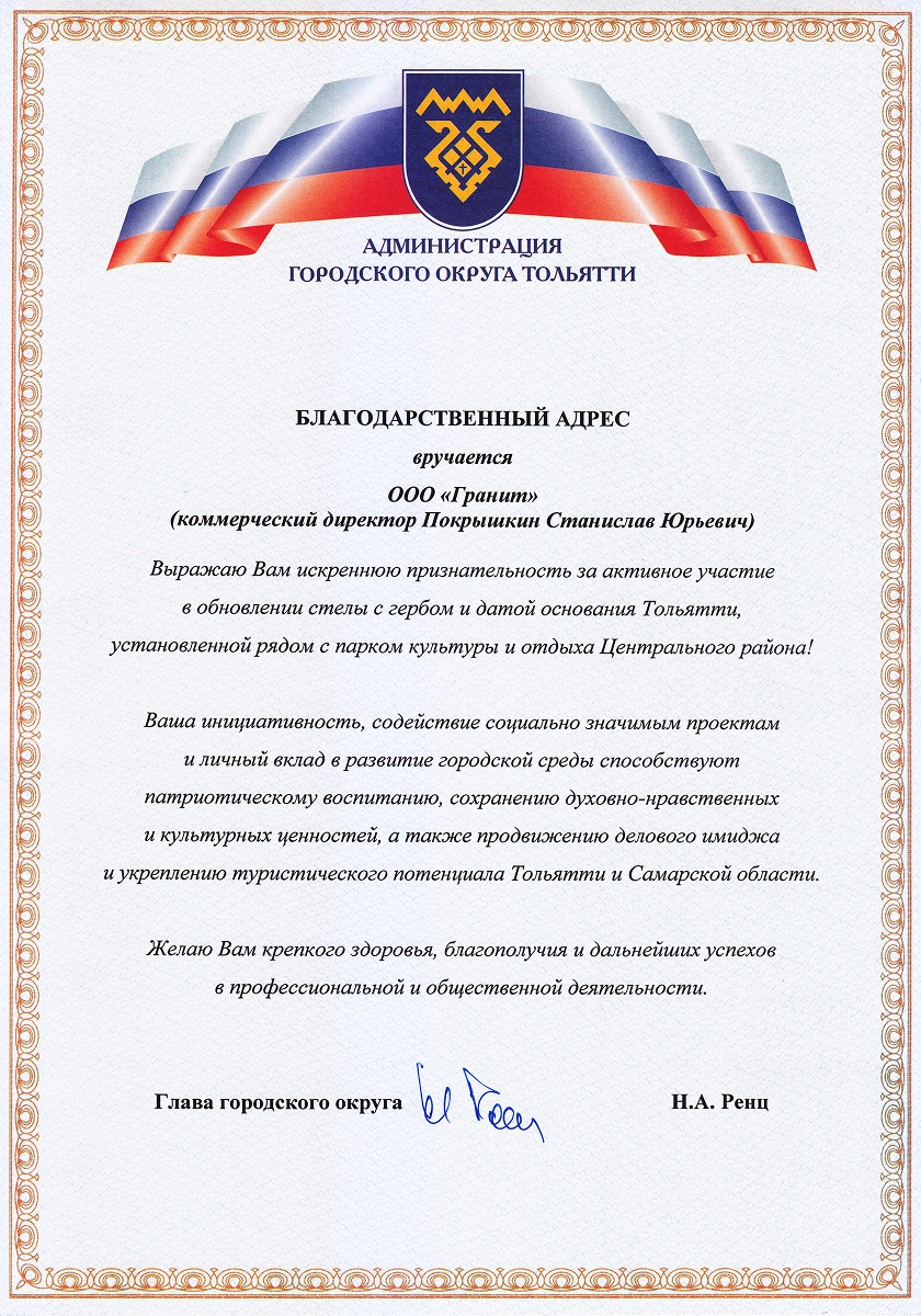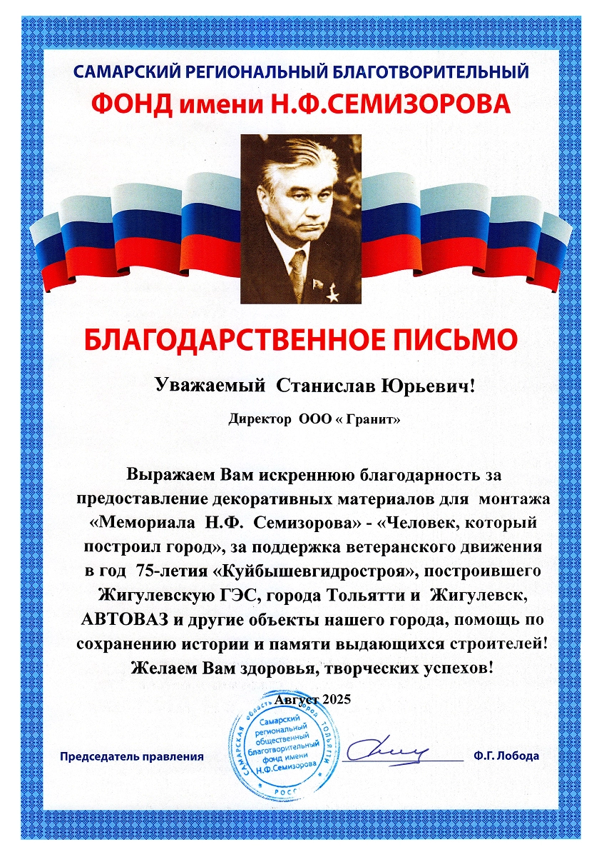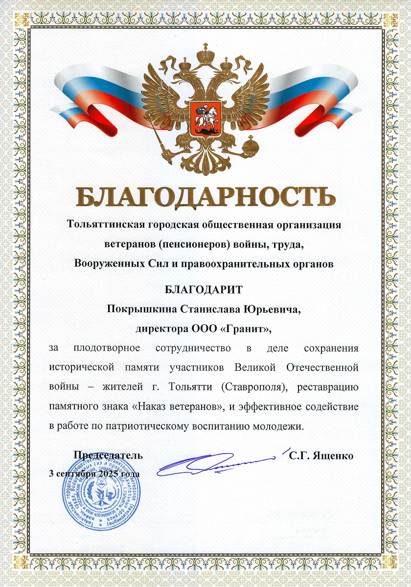 Компания была основана в 1998 году Юрием Григорьевичем Покрышкиным и изначально имела другое название. Свое нынешнее имя — «Гранит Памяти» — она получила в 2019 году, когда руководство принял его сын, Станислав Юрьевич. Вместе с командой он провёл ребрендинг и вывел компанию на новый уровень развития. Более 25 лет мы производим в Тольятти памятники из натурального гранита и мрамора — камня, который сохраняет память поколений. За это время компания значительно выросла: открыты новые филиалы и запущена франшиза, позволяющая распространять наш опыт в других регионах. Сегодня «Гранит Памяти» — узнаваемый бренд с широкой сетью партнёров.